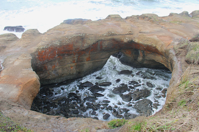 Depoe Bay is a quaint little ocean town with a small marina and lots of tourist shops and restaurants. We've taken a few whale watching tours our of the marina there, but haven't been too impressed. Our whale viewing from the Worldmark resort has been much better and we didn't have to put up with crazy boat captains who seem more interested in trying to make passengers sick then looking for whales. But the town of Depoe Bay is a neat little town to wander around in. A huge sea wall runs the length of the downtown area allowing visitors to shop or dine always within view of the ocean. One of the really nice restaurants there is Tidal Raves with this fantastic view of the ocean from it's diningroom. We also really enjoy the Sea Hag and the Chowder Bowl across 101 from the ocean.